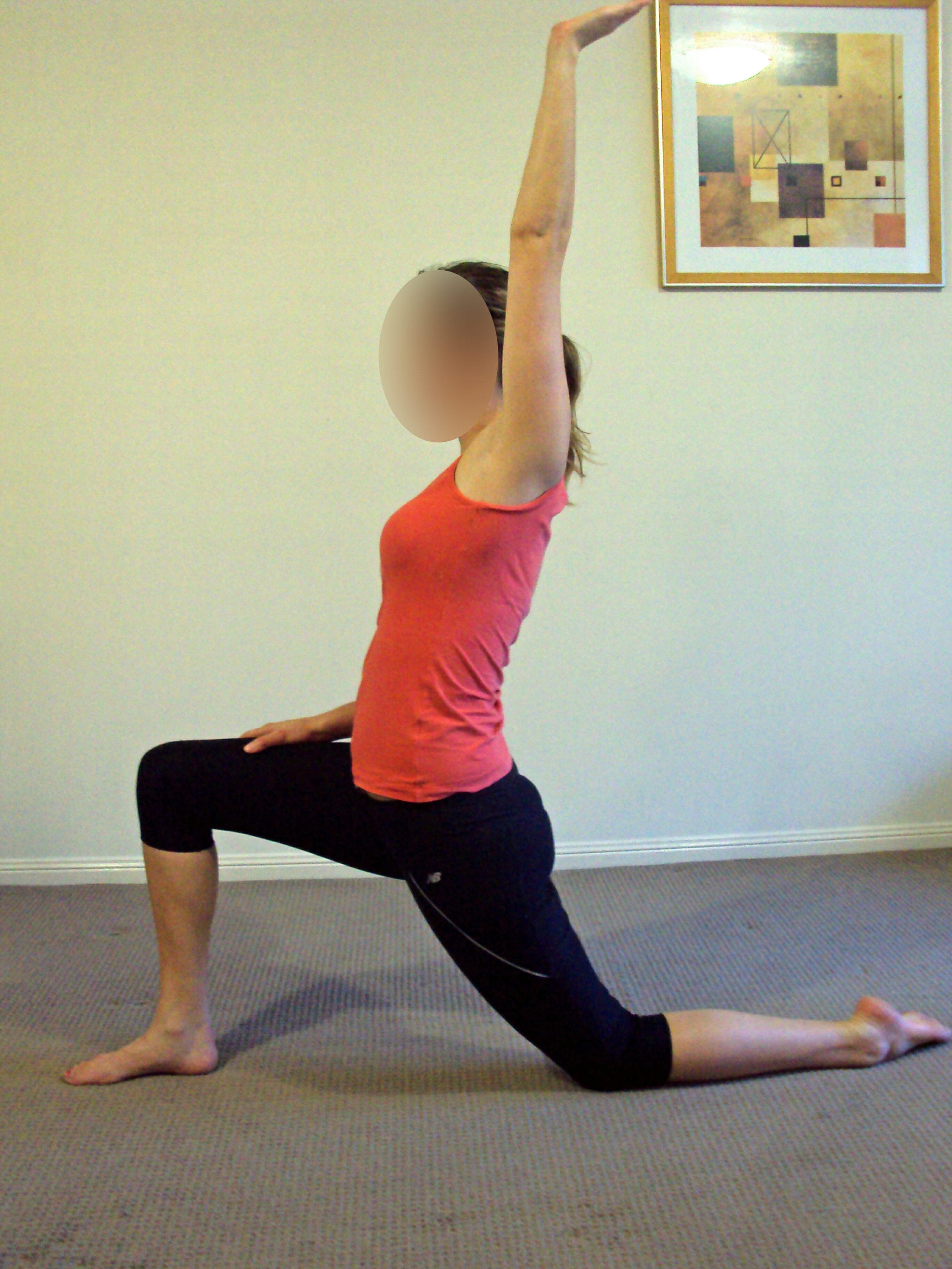 In the position shown, reach up tot he sky, tuck your bottom underneath you and hold for 1 minute.