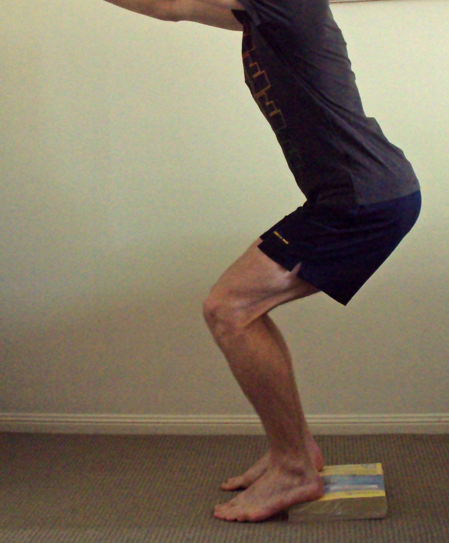 Action: Do not push into pain (if it is sore, don’t go as low), you do not need to go below parallel. Squat like you are going to sit down in a chair and do not let your knees go past your toes.